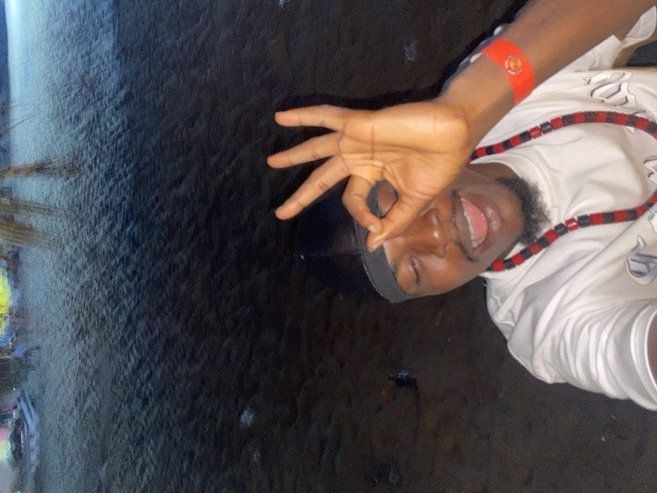 A man with dark skin wears a black durag, a white t-shirt, and a necklace of black and red beads. He flashes an "OK" sign over one eye, sticking his tongue out in the process. A red wristband is visible on his arm. The background shows a beach setting at dusk, featuring sand and distant, blurred lights. The photograph has been rotated.