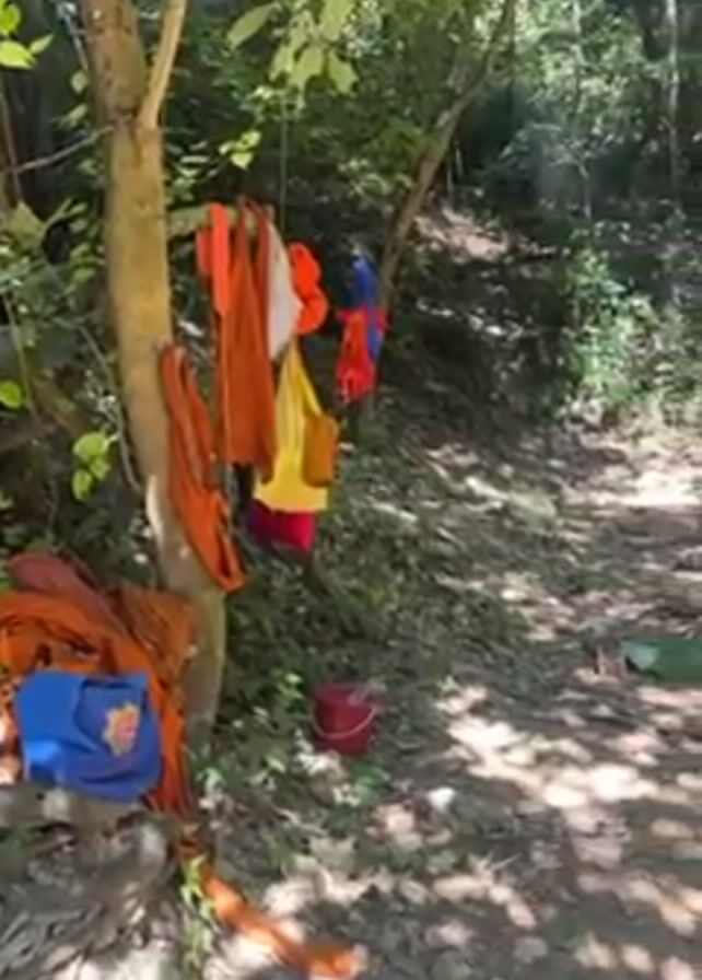 wooded area, possibly a forest or jungle, on a sunny day. In the foreground, several colorful clothes are hanging on a tree, along with a bucket on the ground. Further away, there is some smoke or mist and a clearing in the woods with a green mat and what appear to be sticks arranged in the ground. There are no people visible in the video.