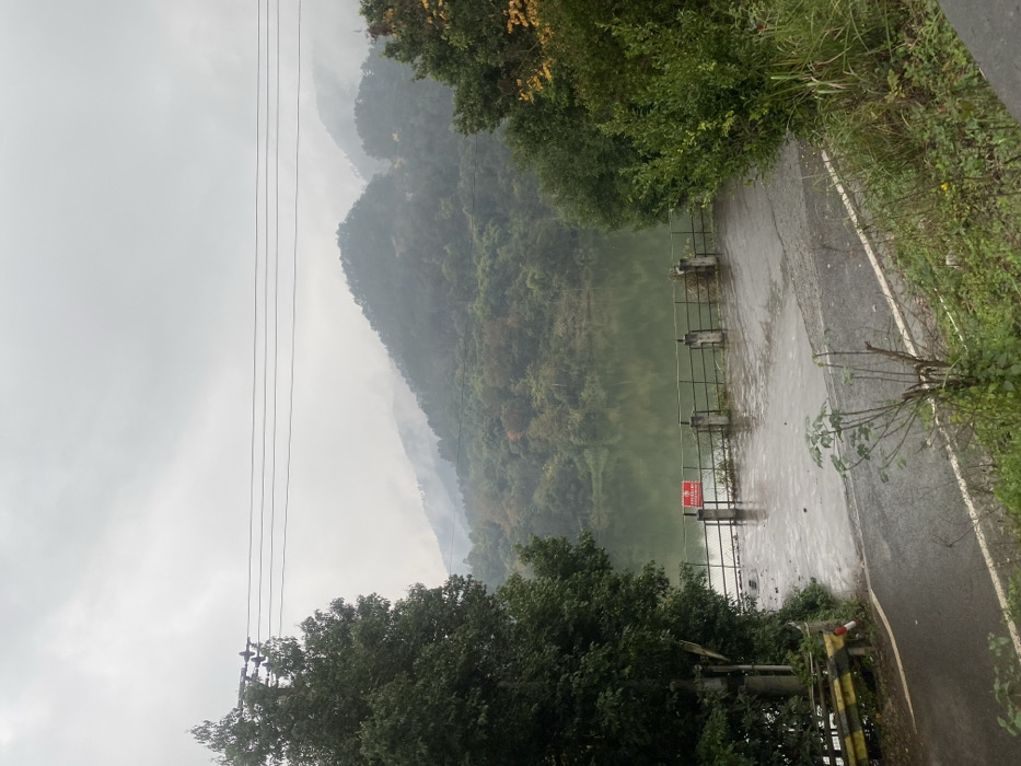 A tranquil lake reflects a misty mountain range under a gray sky. A road runs along the lake's edge, separated by a guardrail. Power lines stretch across the frame, intersecting with lush trees and foliage. The scene evokes a sense of serenity and rural beauty, though the weather suggests a damp or overcast day.