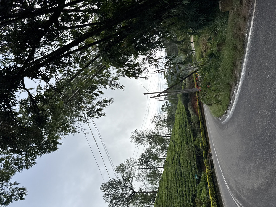 A curving asphalt road with a white line is seen from below, bordered by a grassy edge. A tea plantation rises on the right, a vibrant green expanse. Above, power lines stretch across a cloudy sky. Dense tree branches and foliage frame the top left of the scene. The landscape has a cool, overcast feel.