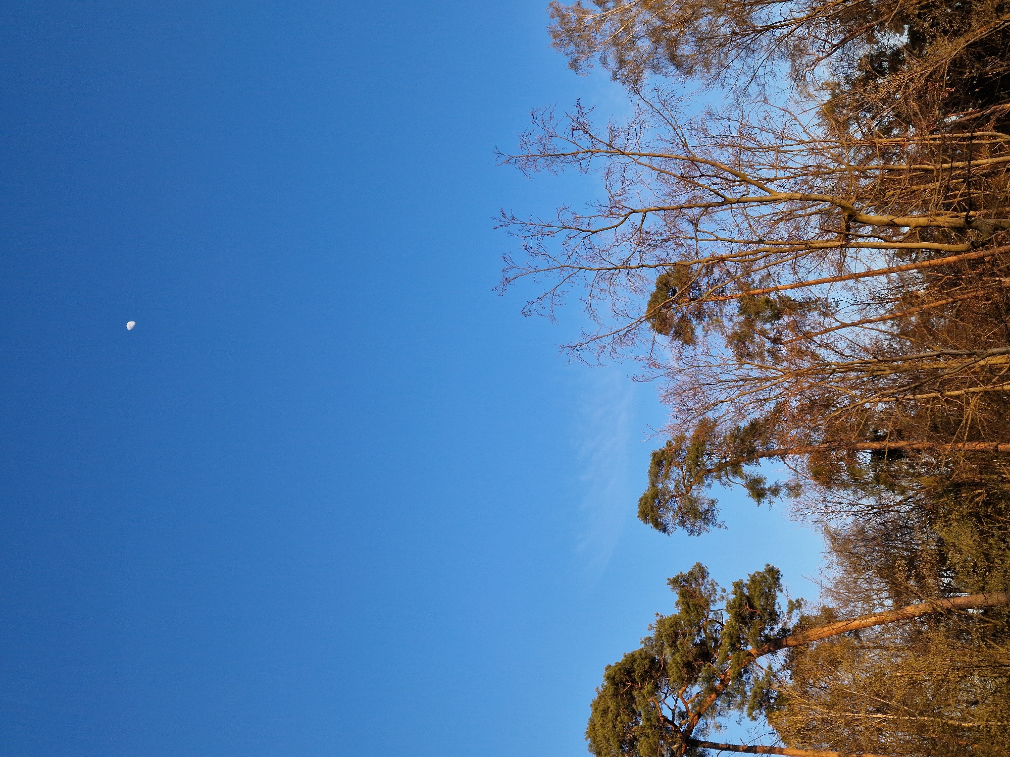 The scene, located in Rüsselsheim am Main, Germany, depicts a natural landscape under a clear, deep blue sky. A white crescent moon is visible in the upper-left quadrant of the sky, with a faint, wispy cloud formation present near the left horizon. The lower half of the image is occupied by a dense line of various trees, illuminated by a low-angle sun casting a warm glow on their branches and trunks. Two prominent conifer trees with dark green foliage and reddish-brown trunks stand on the left. To their right, numerous deciduous trees, predominantly bare of leaves, display intricate patterns of thin, light brown branches. Some trees exhibit sparse, light brown or budding foliage. No individuals, human activity, or artificial structures are present within the frame.