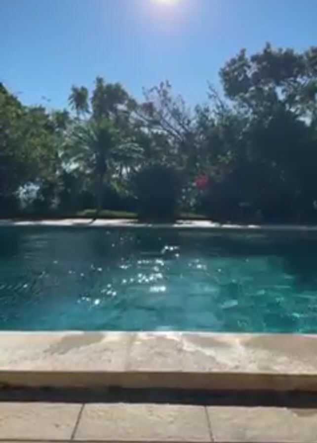 swimming pool on a sunny day. The pool is surrounded by trees and plants, and the water is clear and blue. The sun is shining brightly, and the sky is a clear blue.