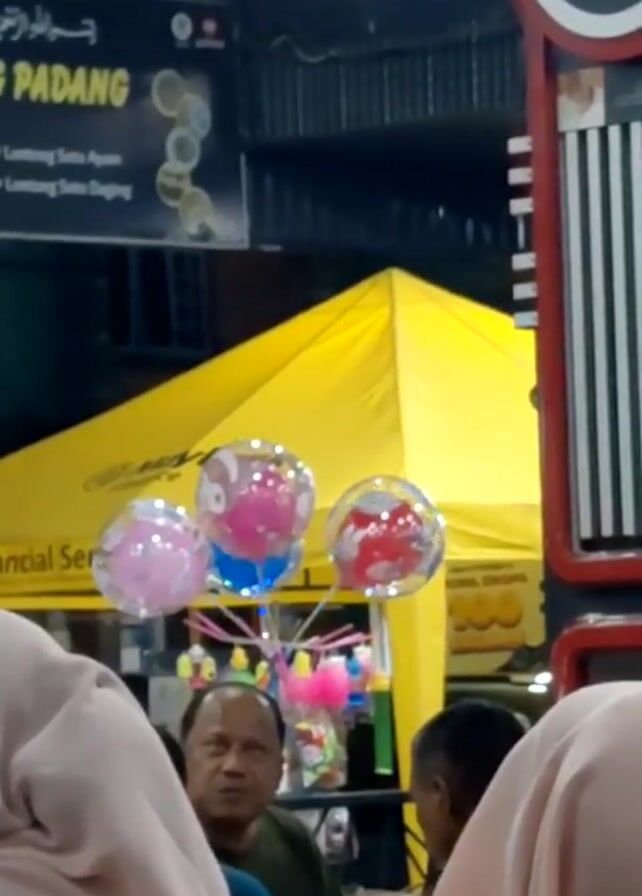 n outdoor scene at night, presumably a food stall area under some roofing. There are three lighted balloons in the foreground. A yellow tent structure is visible behind them. A man is seated at a table, engaged in conversation. Another person, possibly a vendor, in a red shirt and baseball cap, approaches the table. In the extreme foreground are people wearing headscarves at the same table. There are advertisements or signage visible for Padang food and “KupiAce.” The lighting is dim and a little grainy.