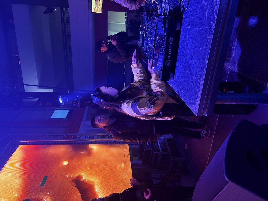 woman in a yellow jacket with her hands near a DJ setup labeled "BOUNZ EVENTS DJ". A man in glasses stands beside her. A person in a black cap takes a photo in the background. A large screen displaying orange and yellow patterns is in the foreground. The scene is lit with blue stage lighting. Equipment and stage elements are visible, creating an atmosphere of an event.