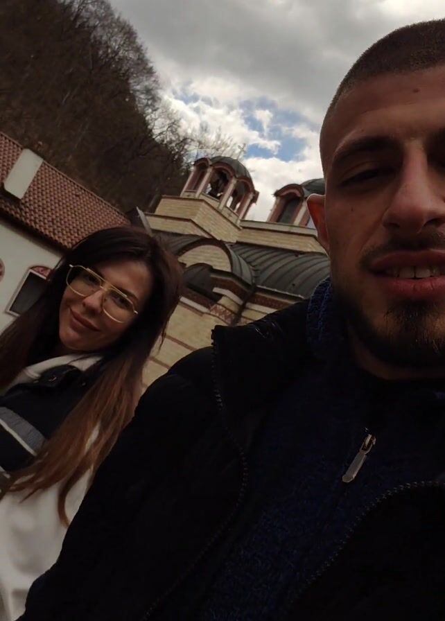 man and a woman taking a selfie outdoors in front of a building with a dome and a cross on top. The man is in the foreground wearing a black jacket and a blue sweater. He has short hair and a beard. The woman is standing to the left of the man, wearing glasses and a patterned jacket. She smiles and poses for the camera, sometimes making a kissing face. The building behind them has a red tile roof and white walls with stone accents. Trees can be seen in the background, and the sky is cloudy.