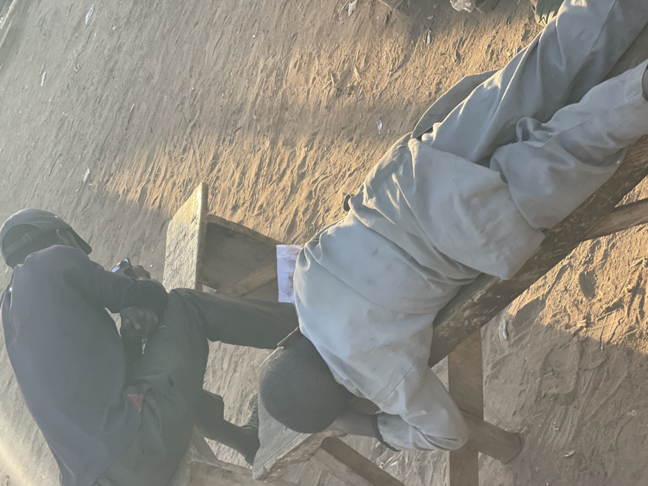 Two individuals are present in an outdoor, unpaved environment in Muchiya, Nigeria, characterized by dry, light brown soil with minor debris. In the foreground, one individual, appearing male, is lying prone on a rudimentary wooden bench, resting his head on crossed arms. He is dressed in light-colored (possibly beige or light grey) long-sleeved clothing and trousers. Behind him, a second individual, also appearing male, is seated on another similar wooden bench. This individual wears a dark long-sleeved shirt, dark trousers, and a dark cap. He is leaning forward, looking down at a mobile phone held in both hands. A small white object, possibly paper, is visible on the ground between the two benches, near the head of the prone individual. The scene is illuminated by natural light, casting soft shadows.