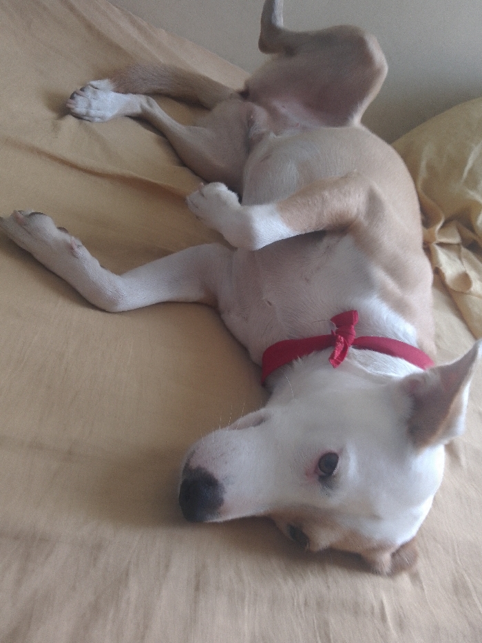 - "A dog with a white head and tan body lies upside down on a tan-colored surface" by FM-LxLjB2, licensed under CC BY 4.0
