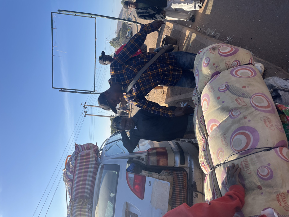 Two men stand near a white car laden with oversized bags and tied mattresses. One man, wearing a plaid shirt and a hat, leans towards the car, holding a paper or money. Another man in sunglasses stands next to the car. The car is heavily loaded, with bags on top and inside the open trunk. Large, patterned mattresses are tied together next to the car. A metal frame stands in the background. The sky is clear and blue.