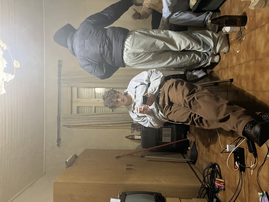 A rotated indoor shot shows three people. One is seated, looking at a phone, wearing a white jacket and brown pants. Another person stands behind, wearing a black jacket and light-colored pants. A third is partially visible in the background with blue jeans. A floor lamp and television are present. A shattered bottle lies on the floor, hinting at a recent incident. Several cables and power adapters are strewn about, adding to the room's cluttered appearance. A radiator is partially visible.