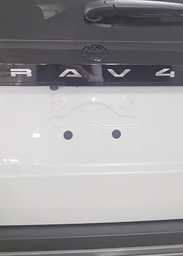 close-up of the rear of a white Toyota RAV4. The RAV4 emblem is prominently displayed, along with the Toyota logo above it. Below the emblem is the area for the license plate. The area is white with two dark circles where screws would go. Below the license plate area, a portion of the rear bumper is visible, showing a grooved texture. A rear windshield wiper is visible at the top. A reflection of a person is visible in the letters of the RAV4 emblem.