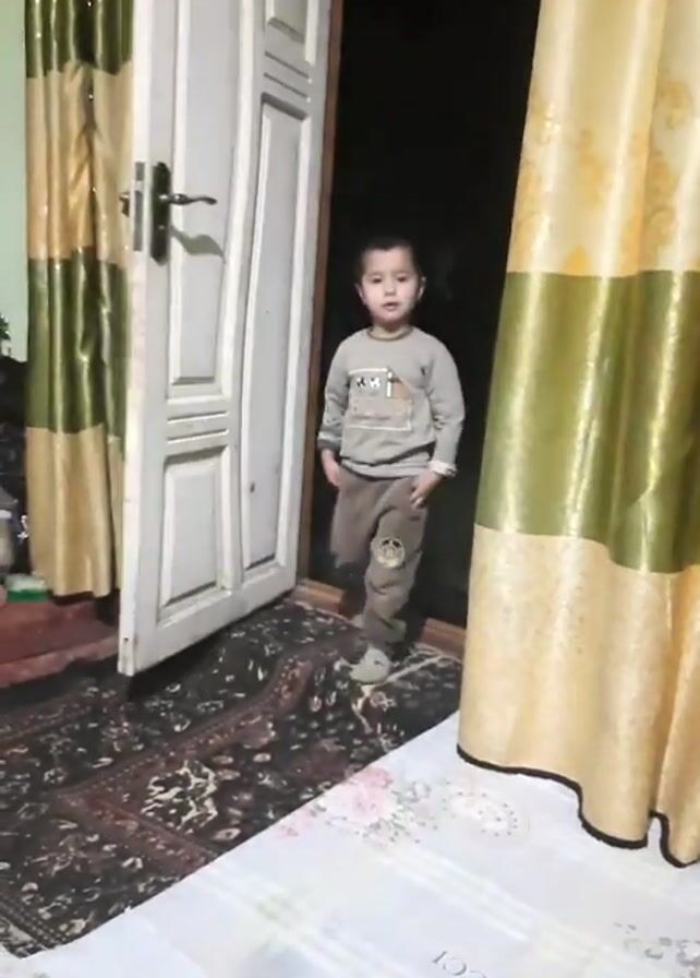 A young boy enters the room from an open door, walking from a dark outdoor space into a lit room