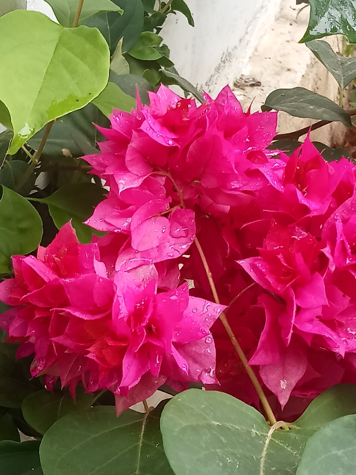 A vibrant cluster of hot pink bougainvillea flowers dominates the scene, their delicate petals covered in droplets of water. Lush, green leaves provide a contrasting backdrop, their surfaces also glistening with moisture. A hint of a light-colored wall is visible in the upper right corner, suggesting an outdoor setting where these flowers are thriving. The image captures the beauty of nature after a rain shower.