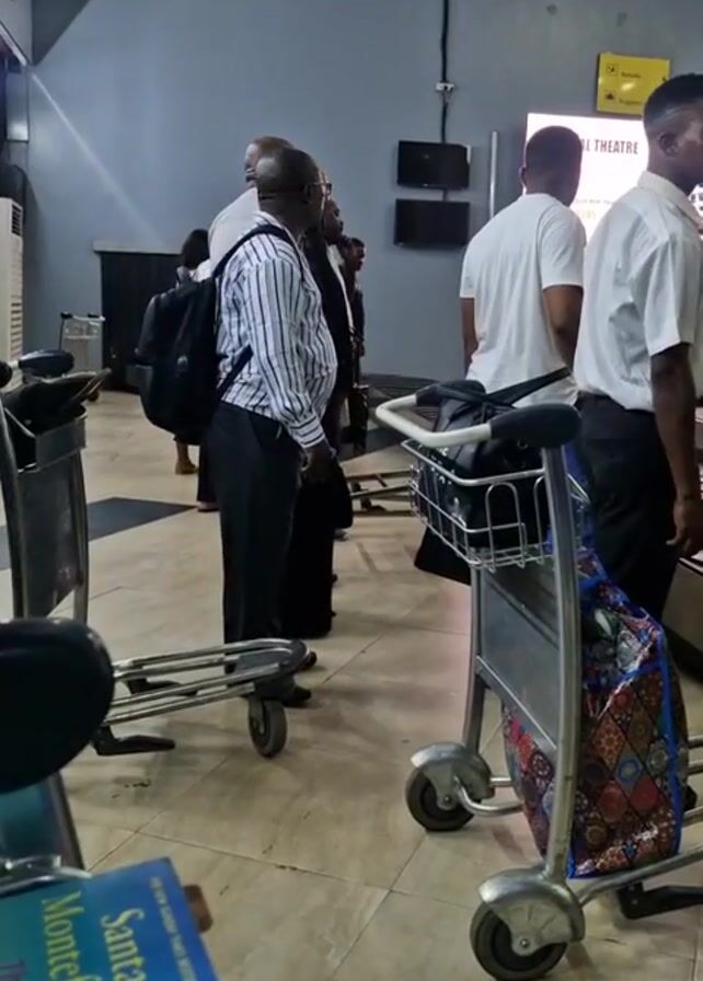 The scene takes place in an airport baggage claim area. Several people are standing or walking around luggage carts, seemingly waiting for their luggage. Three men in white shirts and black pants stand facing the baggage carousel, possibly airport staff. A man in a striped shirt and a backpack stands nearby. A woman in black leggings and a black top walks toward the carousel. A book titled "Santa Montefiore" sits on a luggage cart in the foreground. The walls are painted gray, and there are some monitors and signs visible in the background.