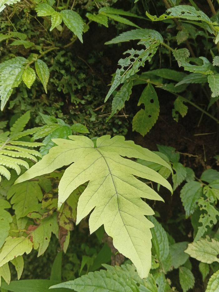A close-up view of dense green foliage, located in the city of Bình Hải, Vietnam. A large, light-green, deeply lobed leaf with distinct dark venation is prominently positioned in the center-foreground, partially obscuring other plants. Surrounding it are multiple smaller leaves, primarily dark green, some featuring serrated margins. Evidence of insect damage, in the form of irregular perforations, is visible on several leaves in the mid-right and upper-right areas. The background consists of dark, earthy tones largely obscured by the overlapping plant material. No human presence, animal life, or artificial structures are observed within the frame.