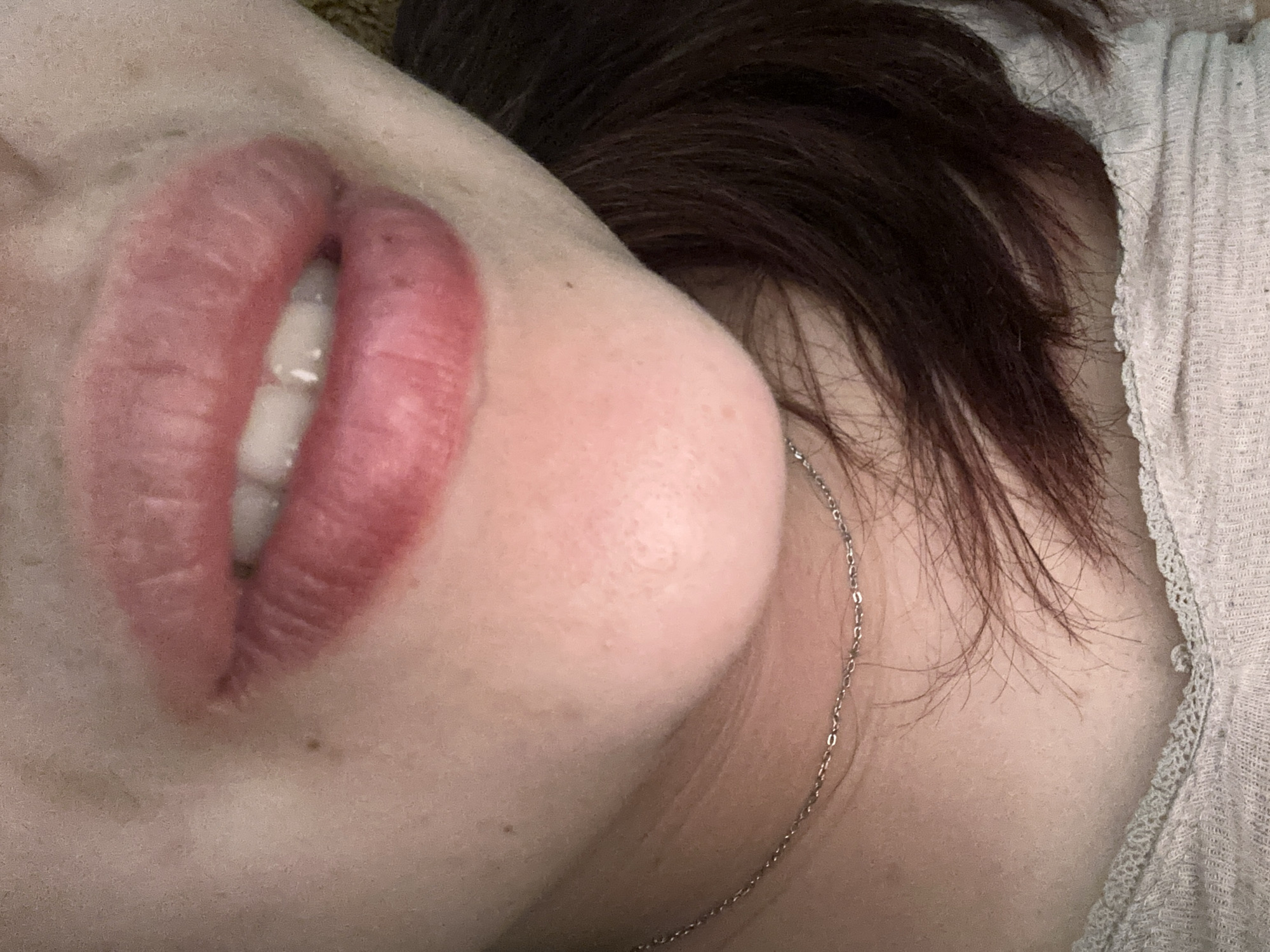 An eye-level, close-up shot focuses on a person's face and upper chest. The subject is lying down, with their head angled towards the left. The most prominent features are the person's lips, which are painted with a red tint, slightly parted, revealing their front teeth. Skin texture is visible, along with a mole. Dark brown hair is visible. The person is wearing a light-colored top with a lace trim along the edge. A fine silver chain necklace is visible. There is no information to determine the specific location in the city of Sofia, Bulgaria.