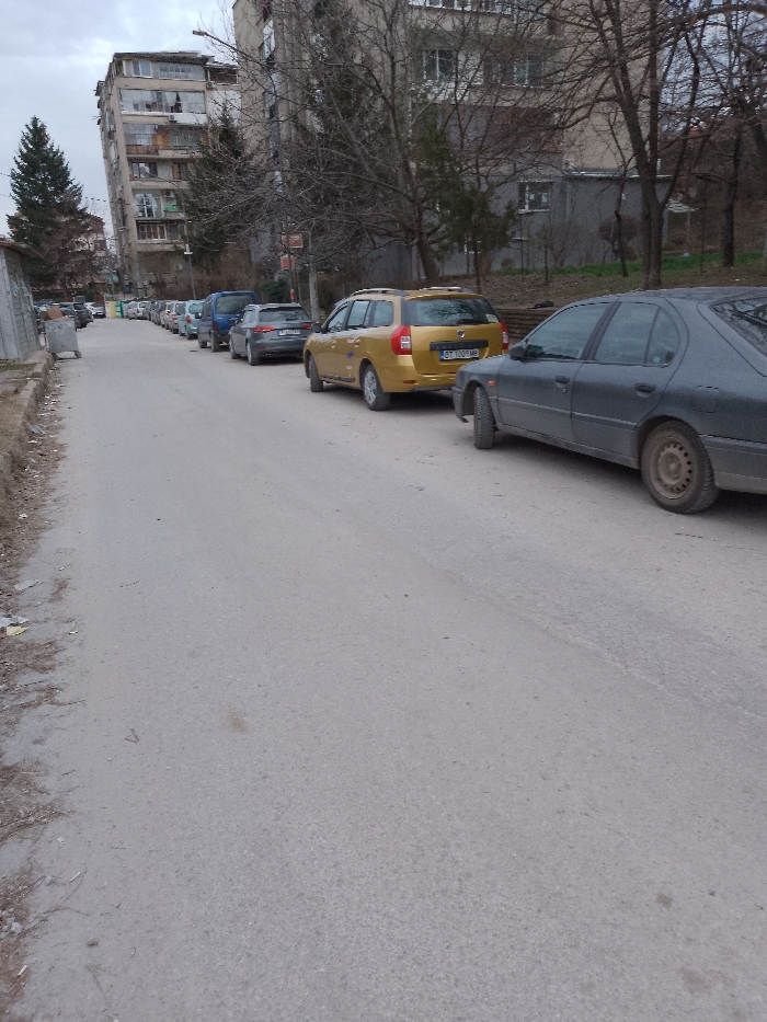 The image displays a static daytime scene on a residential street in Gorna Oryahovitsa, Bulgaria, under an overcast sky