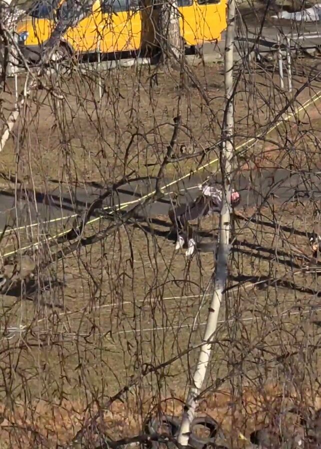 n outdoor scene with trees and a yellow bus. A person in dark clothing and white shoes is suspended in a safety harness and ropes, secured to a utility pole. Another person wearing a backpack appears to be working below them. A yellow caution tape is visible, stretched between the pole and the surrounding trees. The scene is viewed through the branches of a tree, and additional poles and buildings can be seen in the background.