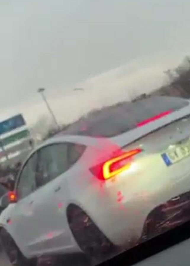 The video, shot from inside a vehicle, shows a rainy traffic situation. The focus is on a white Tesla car with a black roof and black wheels, with its rear lights illuminated. The car is positioned ahead and slightly to the right of the camera vehicle. Adjacent to the Tesla, to its left, is a dark-colored Volkswagen SUV, also with its rear lights on. Road signs indicating destinations like Strasbourg and Illkirch are visible overhead. The general environment is overcast and the road surface is wet, reflecting the surrounding light. There is no visible interaction between the occupants of the vehicles.