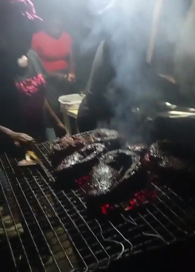 food being grilled on a large outdoor grill. The grill is covered in smoke, and there are several people nearby. The food appears to be meat, and there are a few aluminum foil packets on the upper portion of the grill. The scene is dark, but there are lights visible in the background. The environment appears to be an outdoor food vendor setting.