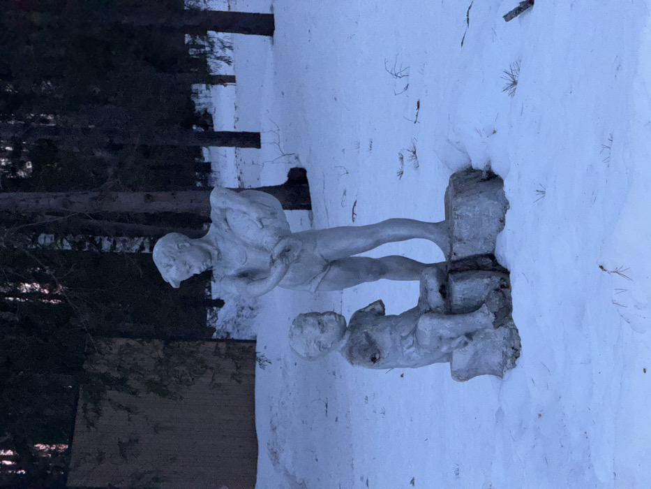 The image displays two light-colored statues of young boys situated outdoors in a snow-covered environment within Mishkino, Russia