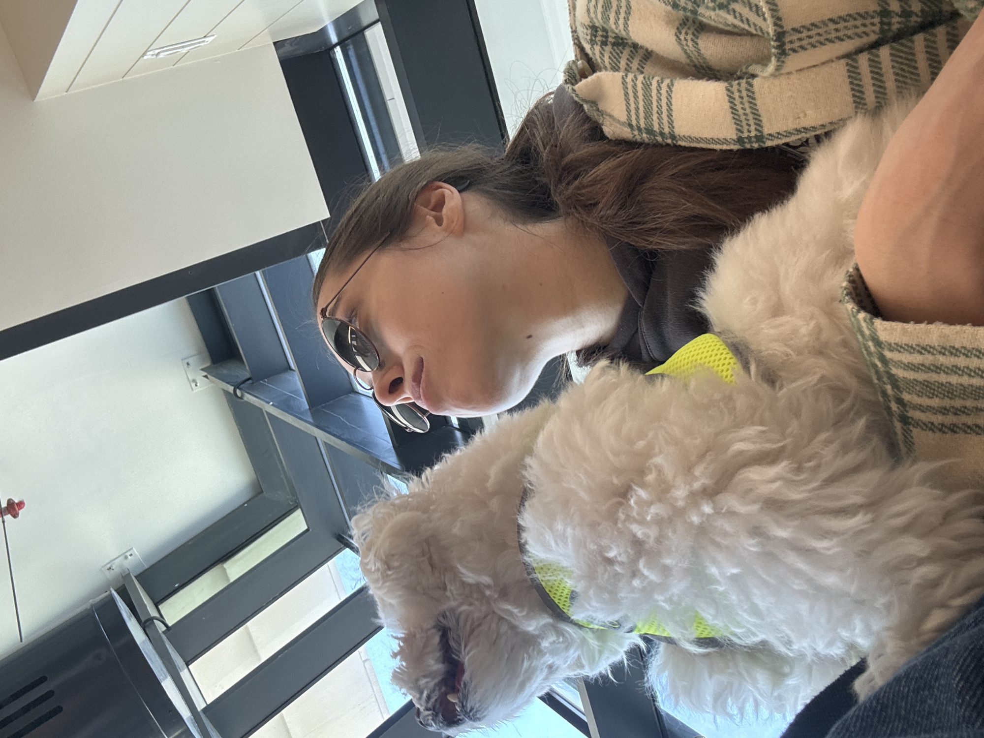 An upward-angled shot captures a female and a small dog within a modern building in Bat Yam, Israel. A female, visible from the chin up, wears brown-tinted aviator sunglasses, a dark grey hooded sweatshirt, and a beige and green plaid jacket. Her brown hair is pulled back into a ponytail, and her head is tilted sharply upwards, directing her gaze to the left of the frame. Adjacent to her is a small, white, curly-haired dog, wearing a neon yellow mesh harness. The dog's head is also angled sharply upwards, with its mouth slightly open, revealing teeth. The background features a white ceiling, black structural beams, and windows or skylights that admit natural light. A red fire sprinkler head is mounted on the white ceiling. The subjects appear to be observing an overhead feature of the building.