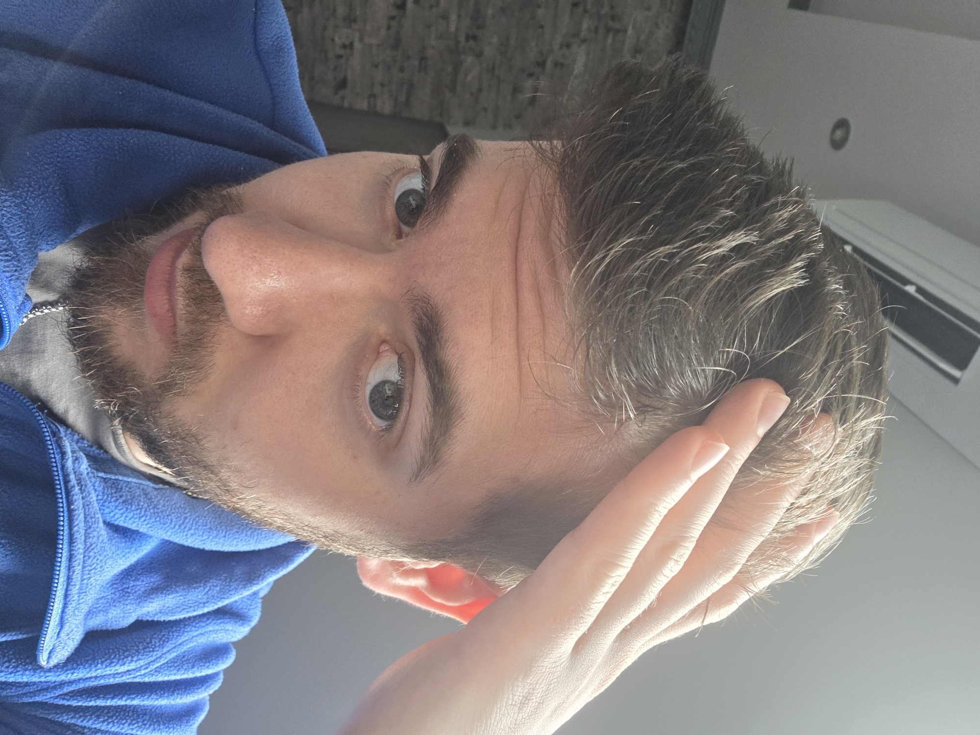 A close-up, slightly angled selfie of a fair-skinned male with dark hair and a short beard