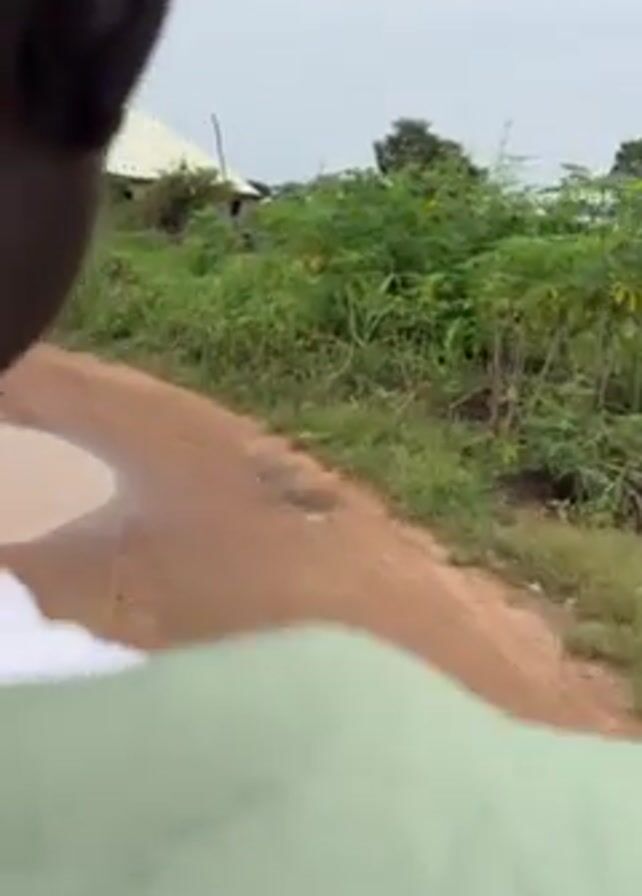 first-person perspective of someone riding on a vehicle along a dirt road in a rural or semi-rural area. The road has tire tracks and a puddle of water. On either side of the road is green vegetation. In the distance, there are buildings and trees. The sky is overcast. The person filming is wearing a light green shirt and a black cap is briefly visible. The vehicle appears to be moving slowly.