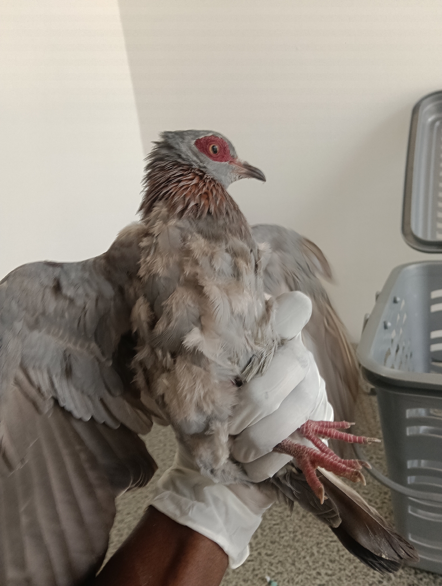 A gray pigeon-like bird with red around its eye is being held in a white gloved hand