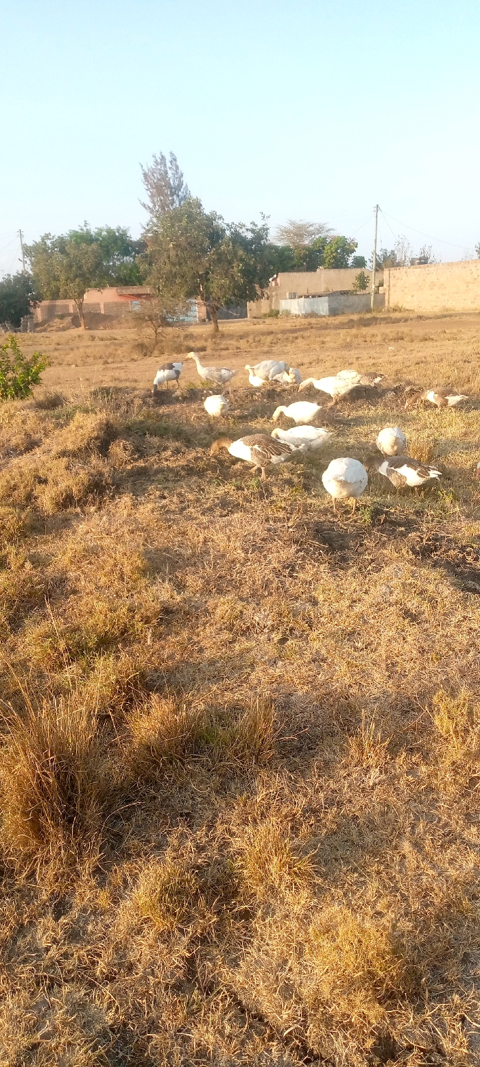 A rural scene under a clear sky features a field of dry, golden grasses. In the midground, a flock of white and grey geese grazes. A few trees punctuate the landscape behind the geese, with simple, single-story buildings visible in the distance. A low brick wall partially encloses one of the structures. The overall composition suggests a simple, pastoral setting.