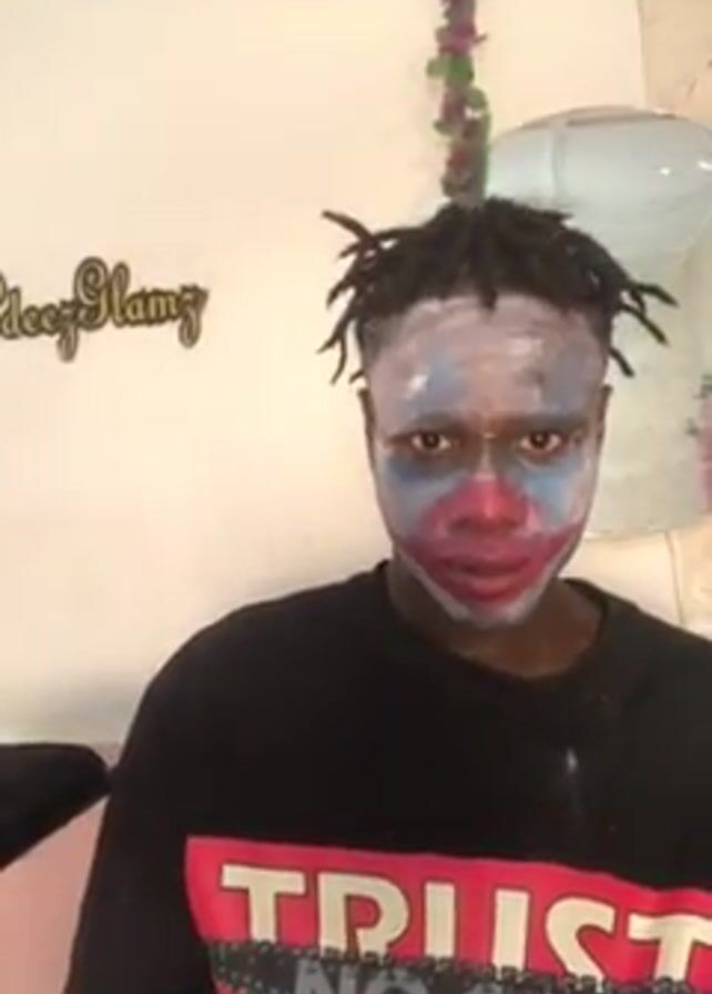 man with dark skin and dreadlocks, wearing a black t-shirt that says "TRUST NO ONE." He has clown makeup on, including white paint on his forehead, blue around his eyes, and red paint around his mouth and nose. He looks directly at the camera. He then puts his hand up to his chin. The background includes a white wall with a floral garland and a mirror with lights around it. The text "Ideez Glamz" is also visible in the background.