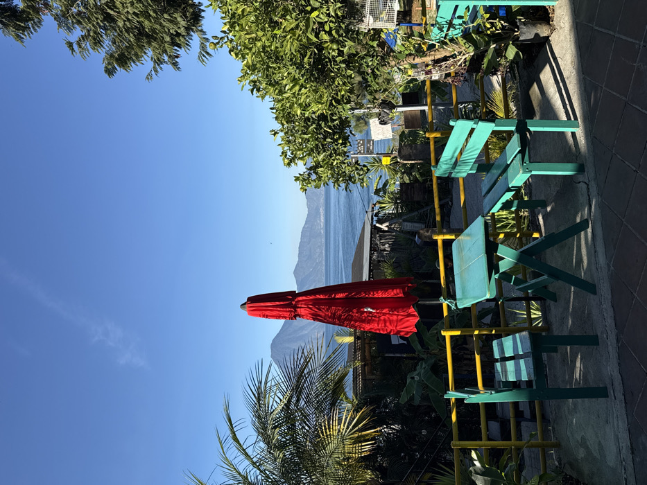 This image depicts an outdoor patio scene in Panajachel, Guatemala, offering a clear view of Lake Atitlán and its surrounding topography under bright daylight
