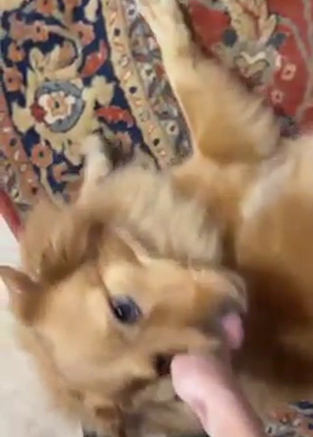 A woman in black stockings and black pants stands on a wood floor, petting a golden-haired dog that lies on its back on a patterned rug. The dog, with its tongue sticking out, looks up at the woman. She scratches the dog's chest. The rug has a red border and a pattern of dark blue, gold, and red. The dog's fur is a light golden color.