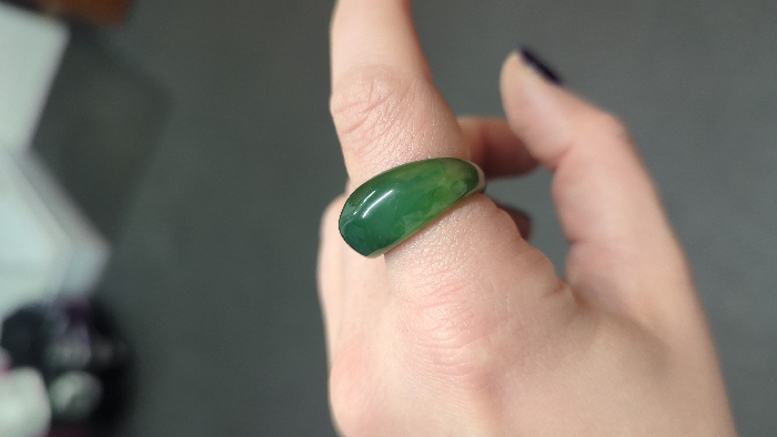 A human hand, likely an adult female's, is prominently featured, centered within the frame. The hand has light skin tone, and the thumb, index, middle, and ring fingers are visible. A wide, smooth, polished ring made of translucent dark green material, consistent with jade, is worn on the ring finger. The ring has an elongated, slightly domed profile. Dark nail polish is visible on the thumbnail at the lower right. The background is out of focus and uniformly dark grey, suggesting an indoor setting with minimal ambient light or a shallow depth of field; no specific environmental details or city location, including Liverpool, United Kingdom, can be determined from the visual evidence.