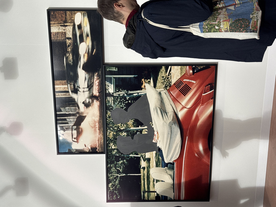 The image depicts an indoor art exhibition setting on a white wall with a reddish-brown floor, illuminated by overhead track lighting casting subtle shadows. Two framed photographic artworks are displayed. The top artwork is a horizontal panoramic photograph showing a dynamic, blurred street scene at night; a light-colored car with headlights on is visible on the right, and a bright orange-red explosion or fire erupts on the left foreground with another blurred vehicle. The bottom artwork, larger and also horizontal, features a red Volkswagen Beetle convertible with its top down, parked in a suburban setting with green foliage and a house in the background. The car's front seats are light-colored, and the rear seat area contains a light canvas cover, with two dark grey, silhouetted figures superimposed, leaning towards each other. A small white and red box, possibly containing food, rests between these silhouettes. On the right side of the frame, a male individual with short light hair, wearing a dark navy hooded jacket over a red collar, stands partially visible, looking downwards or to his left. He carries a white canvas tote bag over his right shoulder, featuring a colorful illustration of a coastal town, boats, and text including "CANNES" and "CÔTE D'AZUR." The scene takes place in the city of Paris, France.