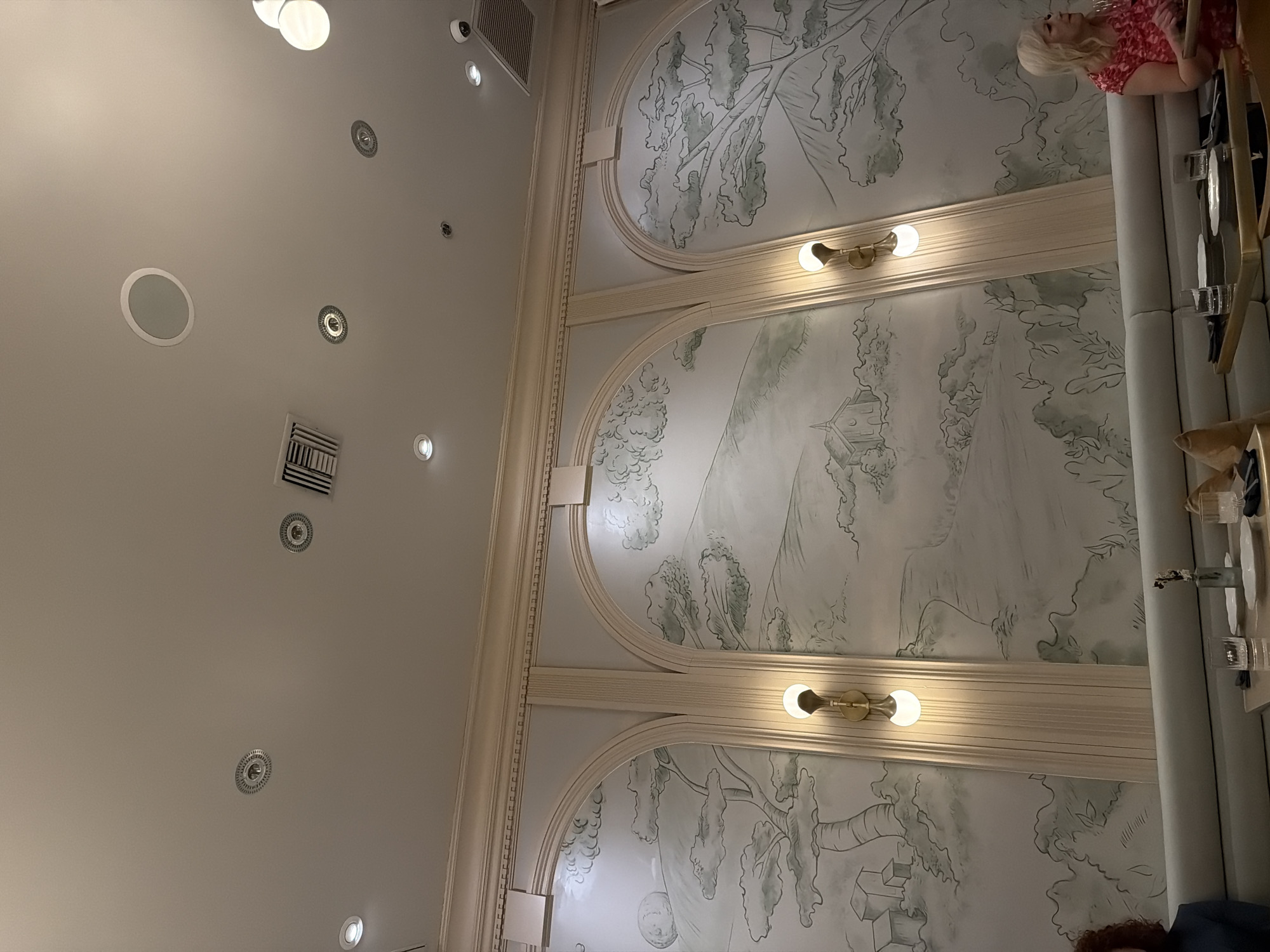 The image depicts the interior of Carbone restaurant, located within the Aria Resort & Casino in Las Vegas, United States. The scene focuses on a decorated wall and ceiling. The wall features three prominent arched panels displaying a monochromatic mural in pale green and white/grey. The mural illustrates a stylized landscape with rolling hills, various trees, a large celestial body (moon or sun), and several small buildings, one resembling a church or chapel. The arches are framed by light-colored, ornate fluted pilasters, topped with decorative molding. Two double-bulb sconces, with brass fixtures and spherical white bulbs, are mounted on the pilasters, emitting a warm glow. Below the mural, a long, light-colored upholstered banquette spans the length of the wall. In front of the banquette, dark-topped dining tables with gold-colored edges are set with white plates, clear water glasses, and dark napkins. One table includes a small vase holding dry, minimalist botanical elements. The ceiling is white and flat, equipped with multiple recessed downlights, a circular ceiling-mounted speaker, and an HVAC vent. Two individuals are partially visible. On the far left, the back of a person's head with reddish-brown curly hair and a dark blue garment is shown. On the far right, a blonde-haired woman, wearing a red and pink patterned top, is seated at a table, facing slightly left. Her right hand rests on the table. Both individuals appear to be seated and engaged in dining or conversation within the restaurant environment.