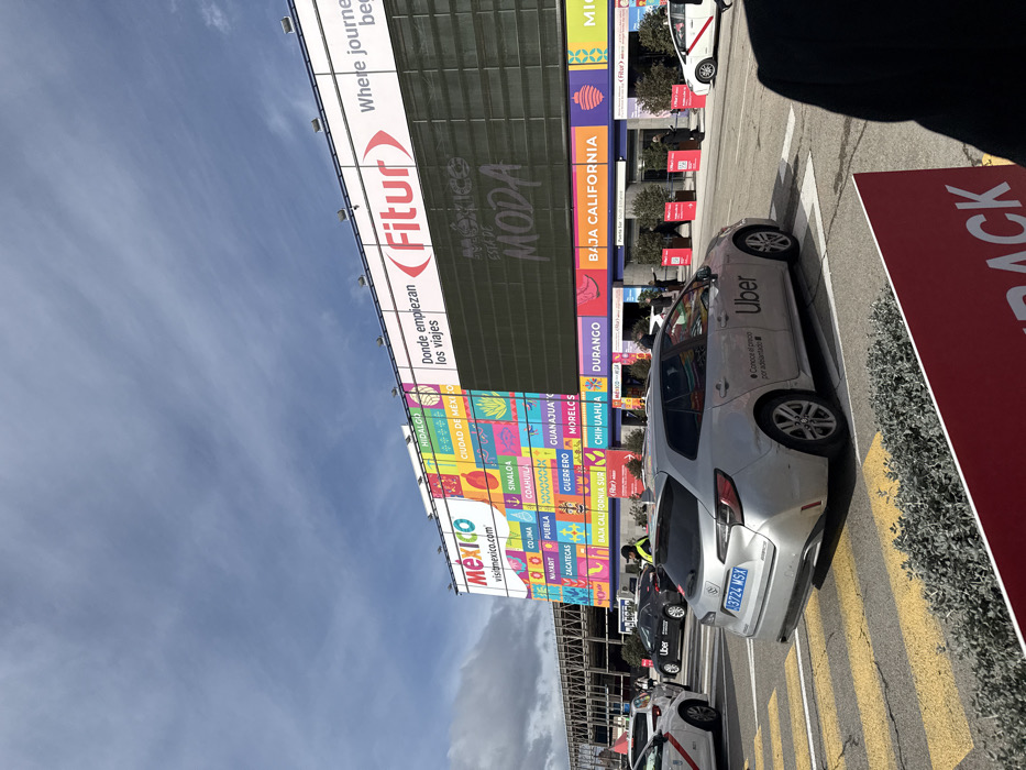 The image depicts an outdoor street scene in front of a large exhibition building, identified by "Fitur" and "IFEMA" branding, located in Madrid, Spain
