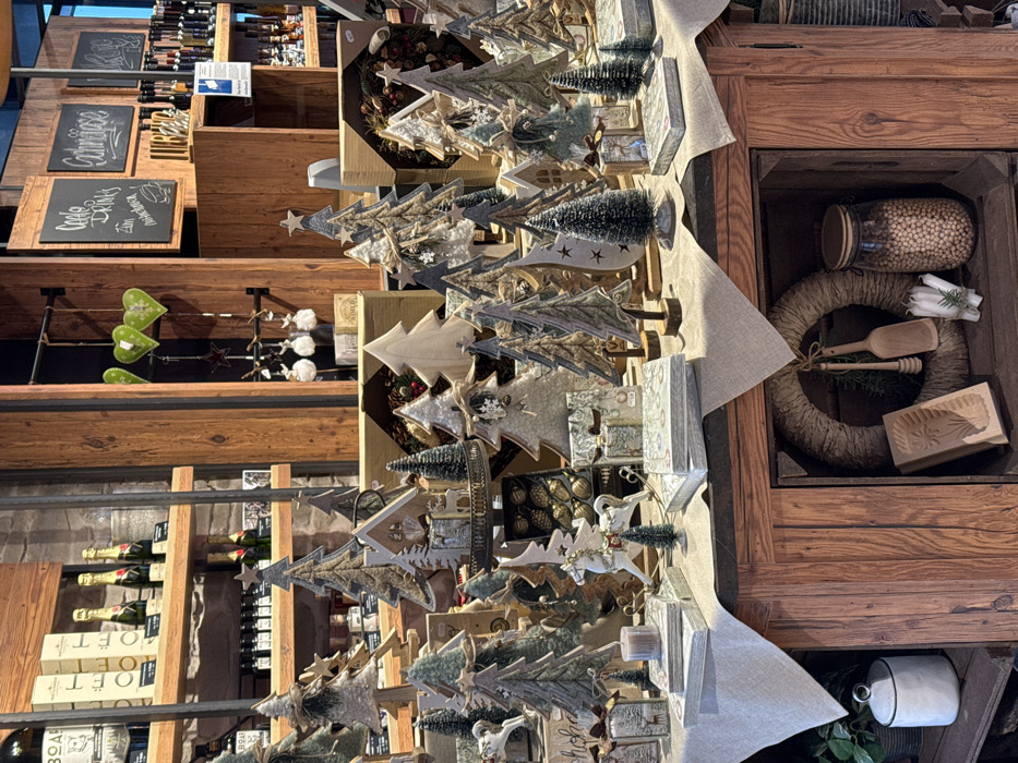A wooden shelf displays Christmas decor. Rows of wooden Christmas trees are arranged on a neutral-toned cloth. Additional shelves showcase wine bottles, black chalkboards, and decorative hearts. Below, more wine is stacked beside boxes labeled "MOET." A wooden crate contains a wreath, wooden utensils, and a jar of beans. Overall, the scene evokes a rustic and festive atmosphere.