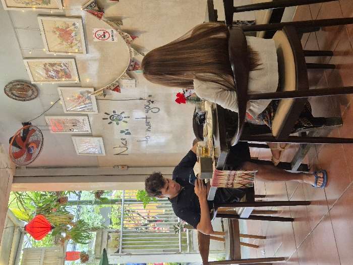 A man in a dark blue shirt sits at a table, looking at his phone. Across from him, a woman with long brown hair sits with her back to the camera. They are in a cafe with art on the walls and a fan. A lantern and greenery are visible outside the window. The cafe has chairs with brown wooden frames and light cushions.