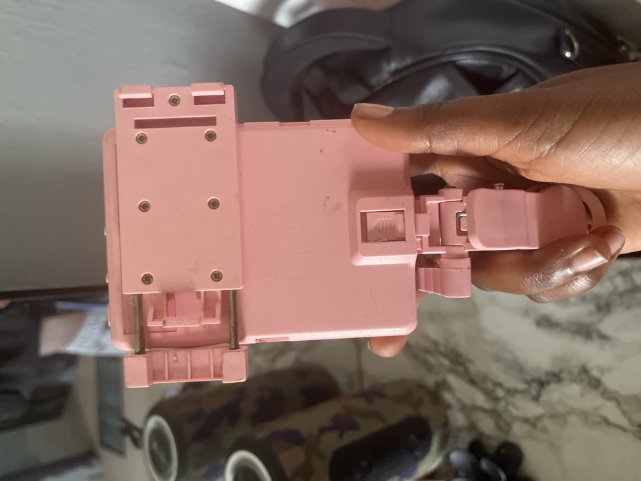 This image, captured indoors in Gbongan, Nigeria, displays a dark-skinned hand holding a used pink plastic smartphone holder or selfie stick component. The device is oriented vertically, showing its back side, which features a flat rectangular panel secured by four small screws and two visible horizontal metal rods that enable an adjustable mechanism. A small, square button with an upward arrow icon is present near the bottom, above a hinged lower section that likely serves as a clip or tripod mount. The pink plastic exhibits minor scuffs and dirt marks. The individual's hand holds the device firmly, with fingernails appearing clean and polished. In the blurred background to the left, two cylindrical containers with a camouflage pattern rest on a light-colored, possibly marble, surface. To the right, a dark object resembling a leather bag is partially visible.
