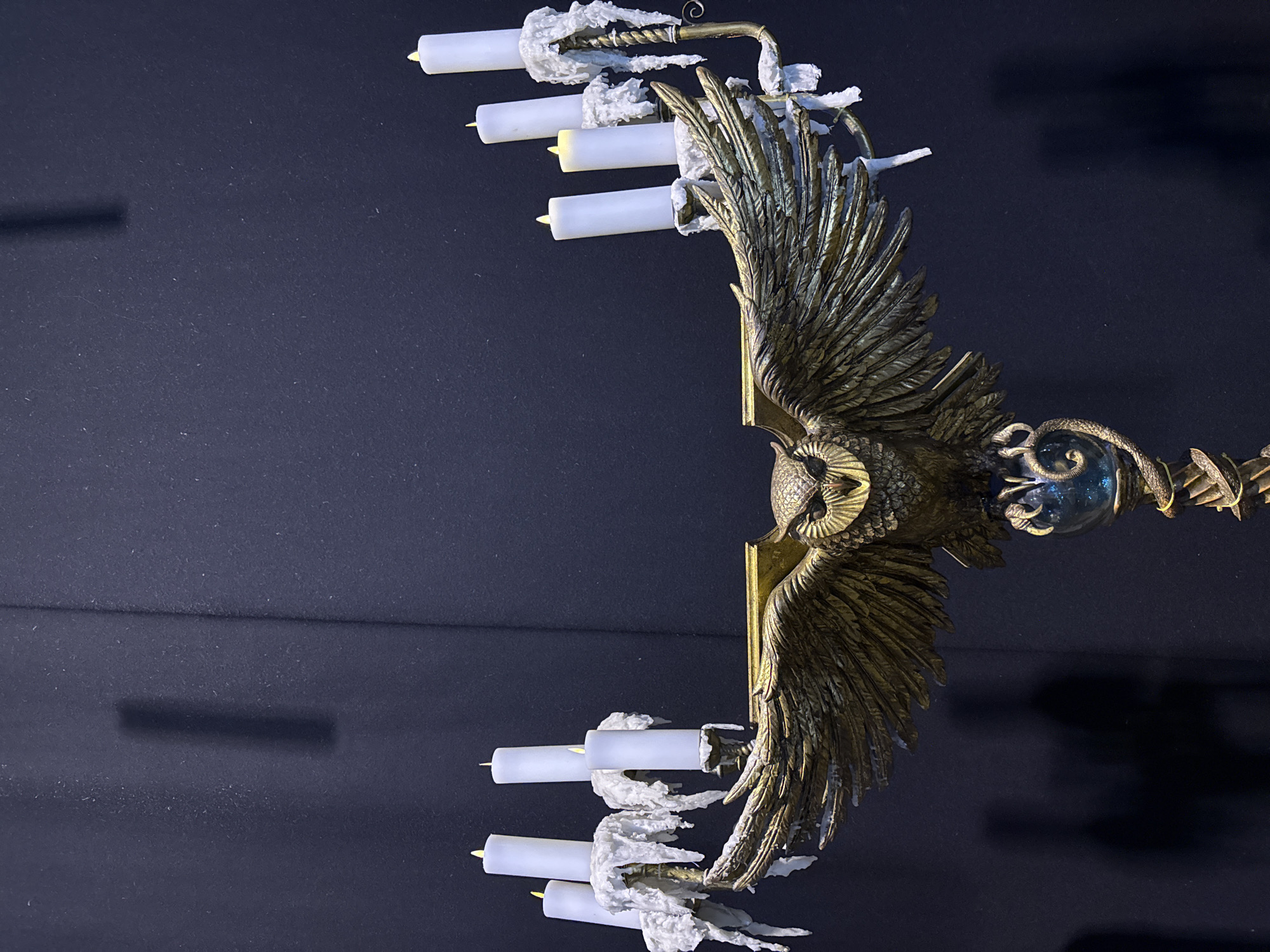 The image displays a detailed, dark gold-toned metal candelabra, observed against a dark, textured fabric background. The scene is located in Three Rivers, United Kingdom. The primary subject is a large, ornate candelabra featuring a central owl figure with outstretched wings. The owl exhibits intricate feather detailing, an open beak, and an alert expression. Its talons firmly grasp a translucent blue sphere, which emits a soft internal light. Below the sphere, a coiled serpentine or dragon-like figure is sculpted around the candelabra's central column. Eight white, cylindrical LED candles, each with a simulated flickering yellow flame, are affixed to the candelabra's wings—four on each side. These candles are set within holders designed to mimic extensively dripped and solidified white wax. The dark background shows minor dust particles and subtle vertical fabric folds, suggesting an indoor display or exhibition setting. No people are present.