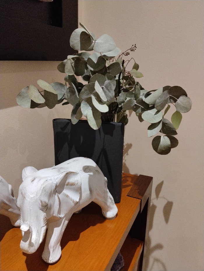 This indoor scene, located in Vila Real, Portugal, presents a static display of decorative objects. In the foreground, two distressed white elephant figurines rest on a polished, light brown wooden shelf. The complete figurine is centrally positioned, facing left, while a second figurine is partially visible on the far left. Behind these, a dark, rectangular container, appearing black, holds a clear glass vase from which a large sprig of eucalyptus extends upwards and to the right. The eucalyptus features numerous round, silvery-green leaves and some small, dried floral elements. Shadows from the eucalyptus leaves are cast onto the plain, light beige wall that forms the background. A dark, rectangular object or shelf section is partially visible in the upper left corner of the frame.