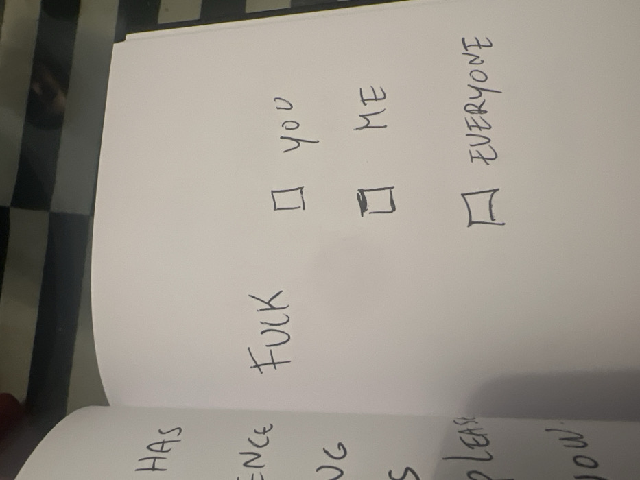 An open book displays handwritten text. The word "FUCK" is written vertically beside three checkboxes. Next to the checkboxes, also written vertically, are "You," "Me," and "Everyone." The lower edge of the image shows portions of other handwritten words, including "HAS," "ENCE," "ING," "S," "PLEASE," and "NOW." The background is a checkered surface.