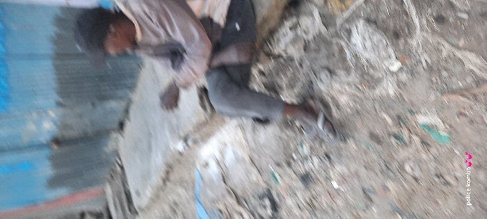 A blurry, full-frame image depicts a lone individual seated in an informal urban environment within Nairobi, Kenya. The subject, a male with dark skin, wears a dark baseball cap, a light brown long-sleeved shirt, dark grey pants, and light-colored flip-flops. He is seated on a rough concrete or stone slab, facing right and slightly hunched, with his hands clasped or held together in front of him. The background features a blue corrugated metal fence or wall, while the foreground shows a dirt ground littered with various refuse including plastic scraps. The overall scene suggests a low-income or informal settlement area. The text overlay "police kombo 💕💕" is present in the lower left corner of the image.
