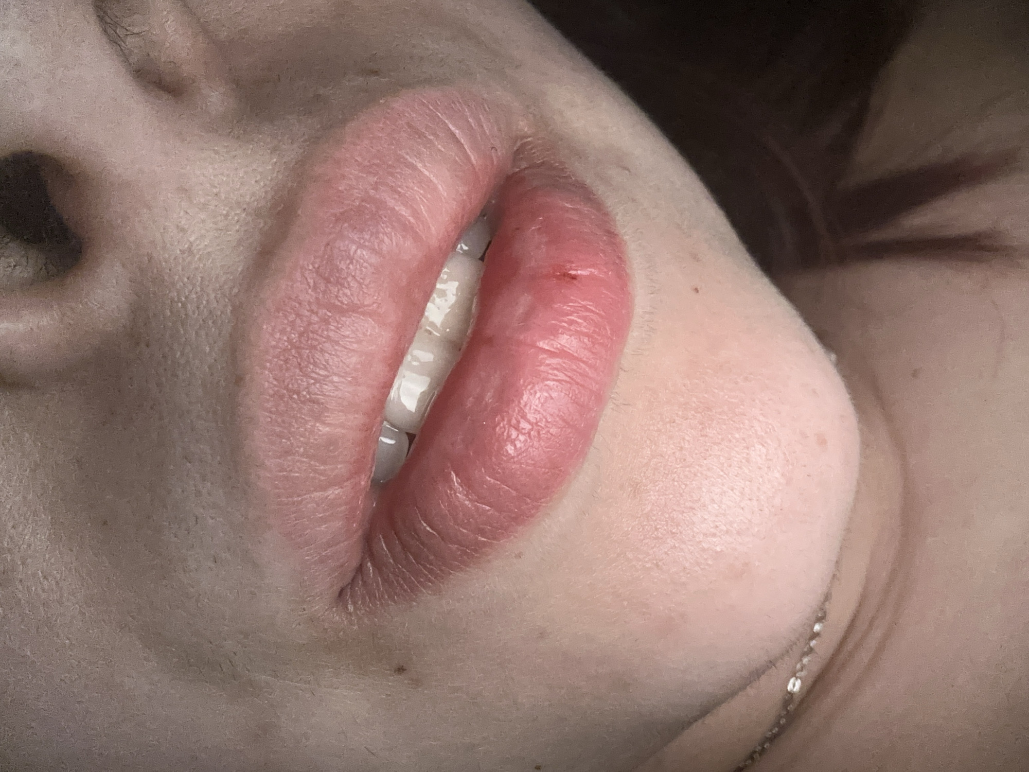 The image displays a close-up, angled view of a human face, focusing on the mouth, lips, and surrounding lower facial features