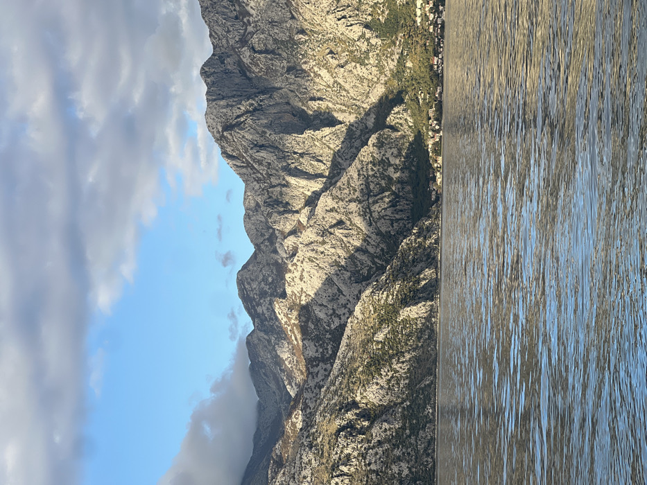 The image displays a mountainous coastal landscape, situated near Bogdašići, Montenegro. The lower half of the frame features a body of water with rippled, reflective surfaces, ranging in color from dark blue to light gray. Above the waterline, a prominent range of rugged, rocky mountains dominates the background. These mountains are characterized by steep slopes, visible geological formations, and sparse vegetation appearing as dark green and brown patches. Strong, directional sunlight illuminates sections of the mountains, rendering them in bright, light gray and beige tones, while other areas are cast in deep shadow, revealing dark gray and black rock faces. Diagonal shadow patterns are evident across the mountain slopes. At the base of the mountains, along the water's edge, a small collection of buildings, likely houses, forms a settlement; these structures are predominantly light-colored with dark roofs and are concentrated on the right side of the image. The sky above the mountains presents a combination of clear blue patches and scattered white and light gray clouds, with some clouds partially obscuring the mountain peaks on the left. No individuals or discernible actions are present.