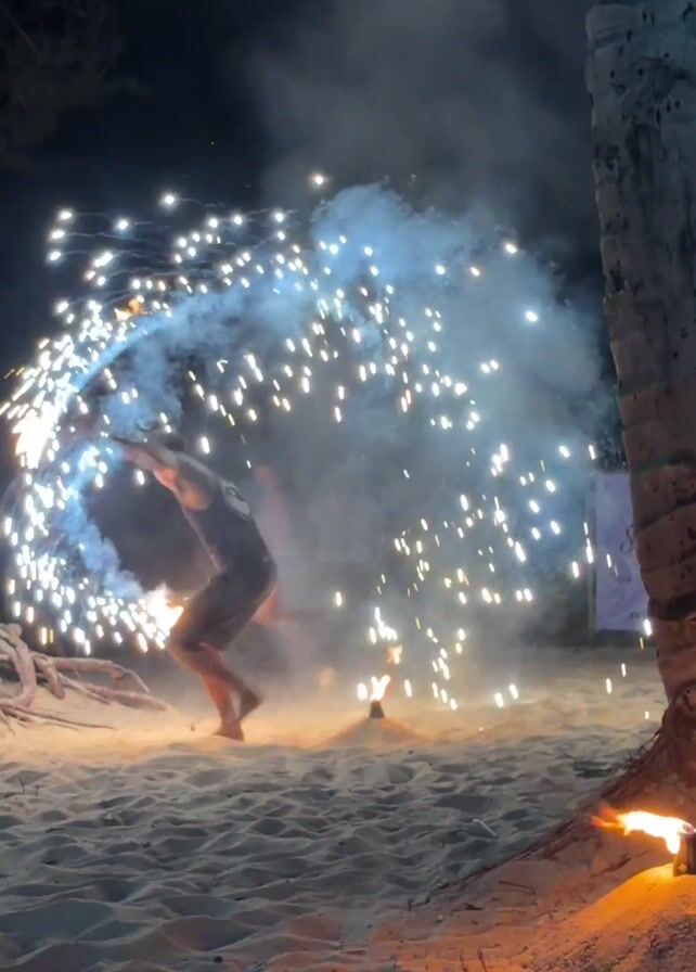 At night on a sandy beach, a man wearing a black tank top and black shorts performs with fireworks. The man juggles or dances with the lit fireworks in a circular motion, creating a shower of sparks and smoke. In the background, another person stands shirtless, and torches burn near a palm tree. The scene is dark, with light coming from the fireworks and torches.