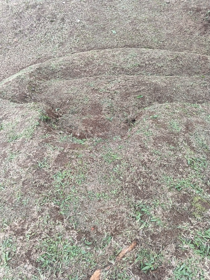 The image displays an outdoor ground-level view of a parcel of land in Lokossa, Benin. The terrain consists predominantly of reddish-brown soil, sparsely populated with short green grass and patches of dry, light-brown vegetation. Multiple parallel, undulating earthen mounds or rows are present, extending horizontally across the frame from the foreground to the mid-ground. Within one of these earthen formations in the mid-ground, two distinct, dark, approximately circular depressions or holes are visible. A segment of wood or root material is situated in the lower right foreground. No individuals, animals, actions, or interactions are depicted in the scene.