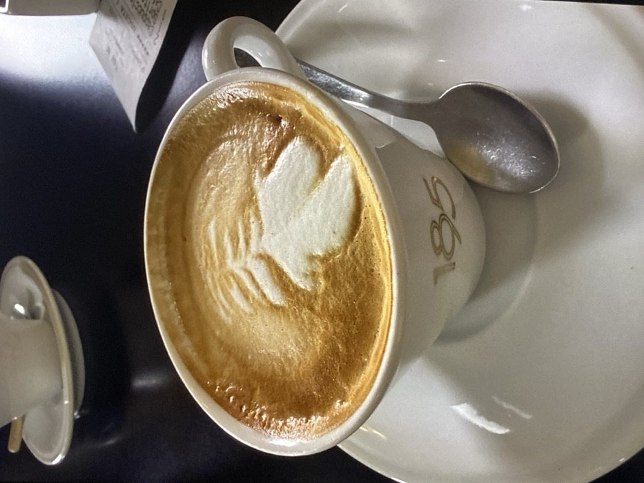- "The image displays a close-up, elevated view of a white ceramic cup of coffee with latte art, featuring a prominent fern or rosetta pattern in the foam" by FM-C8pC53, licensed under CC BY 4.0