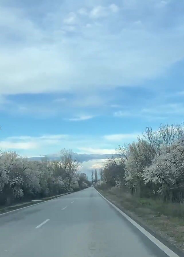 The video depicts a straight paved road flanked by trees, many of which are in bloom with white flowers. The road has a white line marking the center and a narrow shoulder on either side. The sky is blue with scattered white clouds. In the distance, slightly obscured, what appears to be a mountain is visible. The video is taken from the perspective of someone traveling along the road, presumably in a vehicle. There are no other vehicles visible, and no people are present.