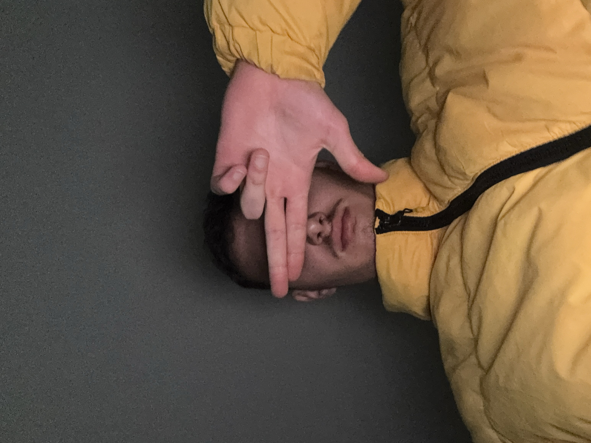 A close-up, slightly rotated photograph shows a person wearing a yellow puffy jacket with a black trim around the collar area. The person's face is partially obscured by a hand that is holding two fingers up in front of their eyes. The background is a gray, textured surface. The location is not discernible from the visual information provided in the image.